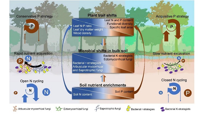 内容 全球氮沉降激增而磷沉降相对缓慢,由此引发土壤氮磷养分失衡的生态问题,这在“富氮缺磷”的热带森林中尤为凸显。植物会通过改变功能性状而调整资源获取策略来适应土壤养分的变化,土壤微生物则通过改变群落结构与功能组成来应对养分波动。然而,在土壤氮磷养分供给失衡的条件下,植物和土壤微生物群落水平上的响应特征及其内在关联仍存在研究空白。