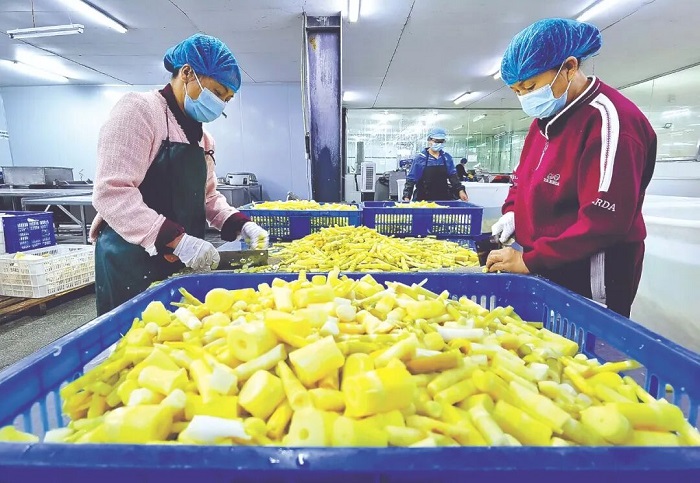 清洗、切分、腌制、装袋、杀菌……流水线上,自动化生产设备高速运转,工人们有条不紊地忙碌着。经加工后,鲜笋变身清水笋、酸菜笋、泡椒笋等多样产品,除供应本地市场外,还销往上海、广东等地。