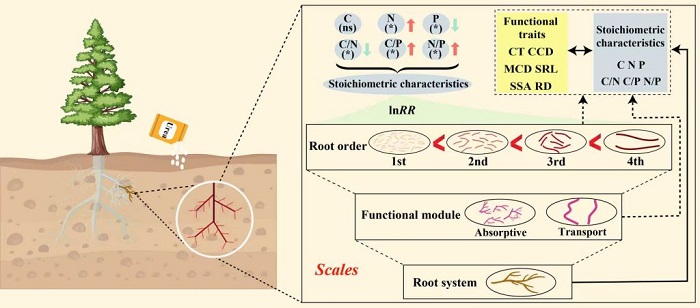 细根C、N、P化学计量特征是刻画植物养分获取策略和环境适应能力的重要指标。然而,长期大气氮沉降背景下不同根序细根C、N、P化学计量响应模式仍不清晰,在一定程度上限制了对根系生理生态可塑性的认识。为此,研究团队于2014年在中国东部沿海水杉人工林中建立长期N添加试验平台,系统测定不同根序细根C、N、P含量及计量比,探究长期N添加下细根化学计量特征的根序特异性响应模式。研究结果表明长期N添加在各根序上均引起细根N含量、C/P和N/P升高,以及P含量、C/N的降低。除细根C含量外,其他化学计量特征性状对长期N添加的响应强度随根序增加而增加,表明由低序级吸收根向高序级运输根转变过程中,根系对外源N输入的敏感性逐步增强。结构方程模型分析表明在根系整体、功能模块及单一根序三个尺度上,N添加对细根C、N、P计量特征的直接效应均强于经土壤性质等介导的间接效应。同时,细根功能性状(如形态和解剖结构)与化学计量特征之间的显著关联主要出现在根系整体尺度,而在单一根序或功能模块尺度上相关性并不显著。总体来看,长期N添加下细根C、N、P计量特征响应随根序升高而增强,且其与功能性状间存在明显的尺度依赖性。