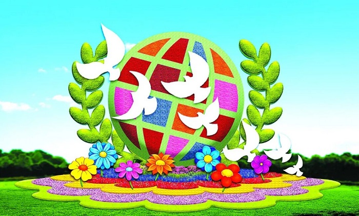 篮内选取了美好寓意的花卉,其中荷花寓意和和美美、月季寓意和平希望、珙桐寓意和平之树、橄榄枝寓意荣耀和平、向日葵寓意自由幸福、山丹丹寓意团结奋进、英雄花寓意英勇无畏,结合和平鸽元素,体现“和平发展、欣欣向荣”,表达对祖国繁荣富强的美好祝福,对世界和平发展的美好期盼。